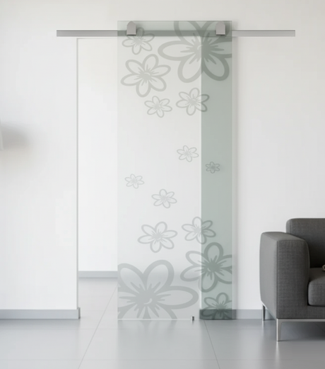 In esaurimento (1 unità)€49999 + IVA€99999 + IVAPrezzo unitario /Non disponibilePorta Scorrevole Vetro Satinato e Disegno Sabbiato con Binario Compact