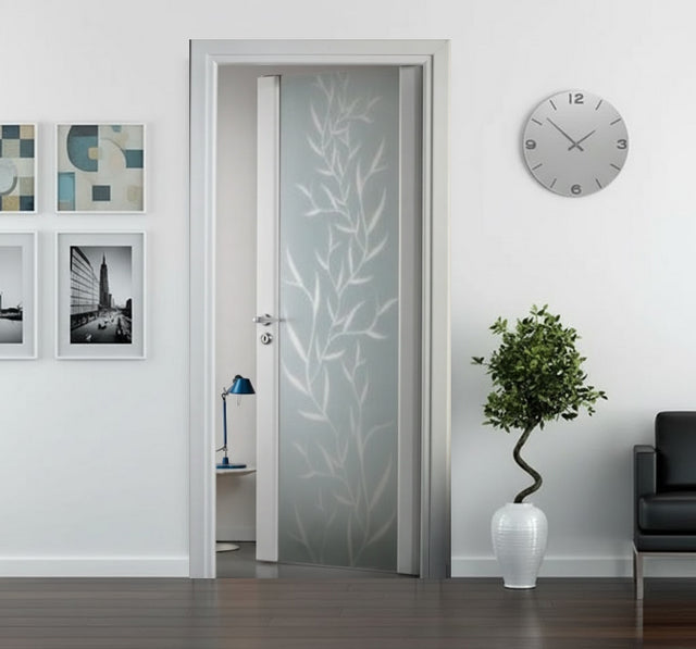 Il vetro presenta un fondo satinato con dettagli decorativi traslucidi, ideali per garantire privacy senza rinunciare alla luce.